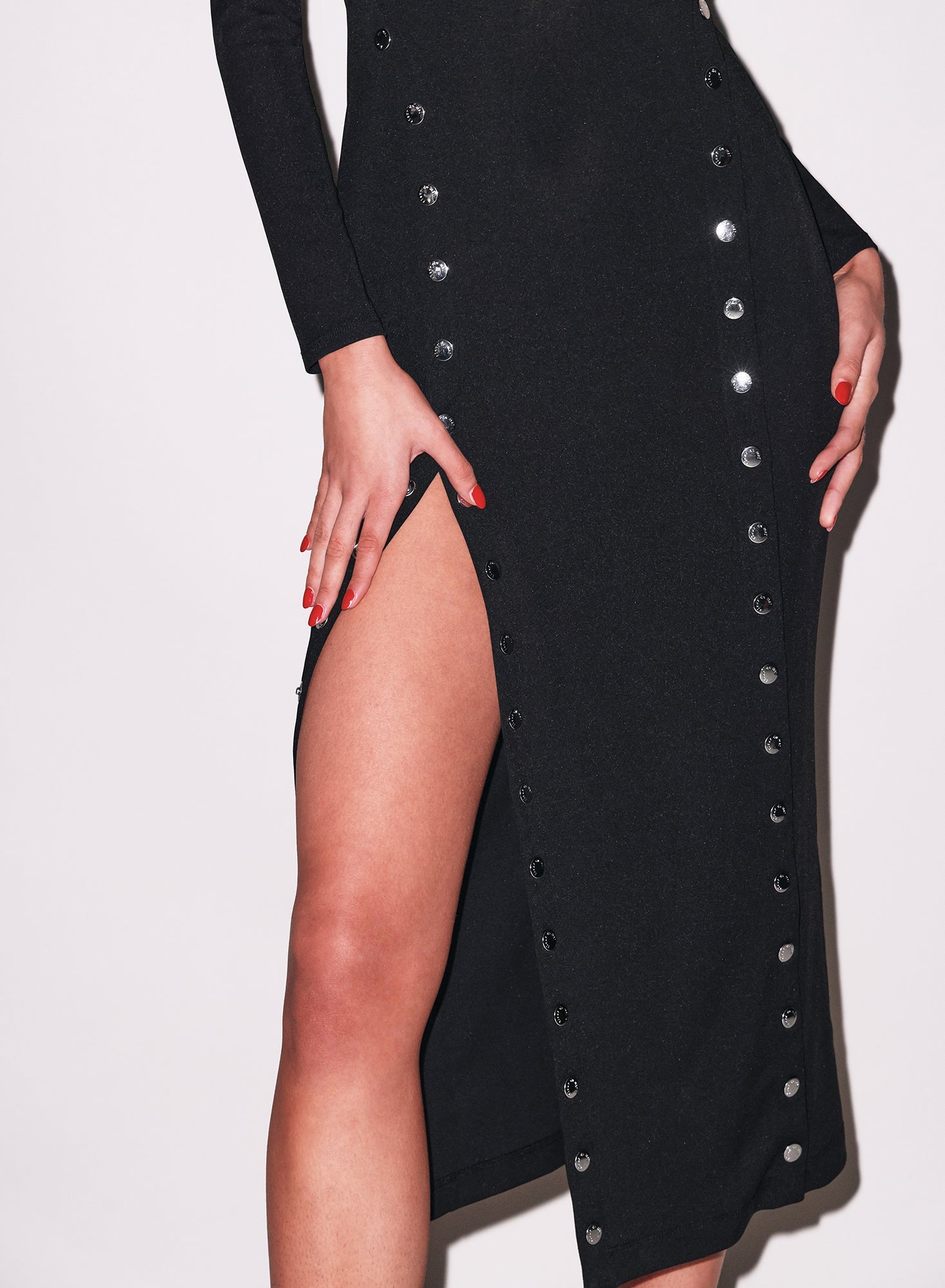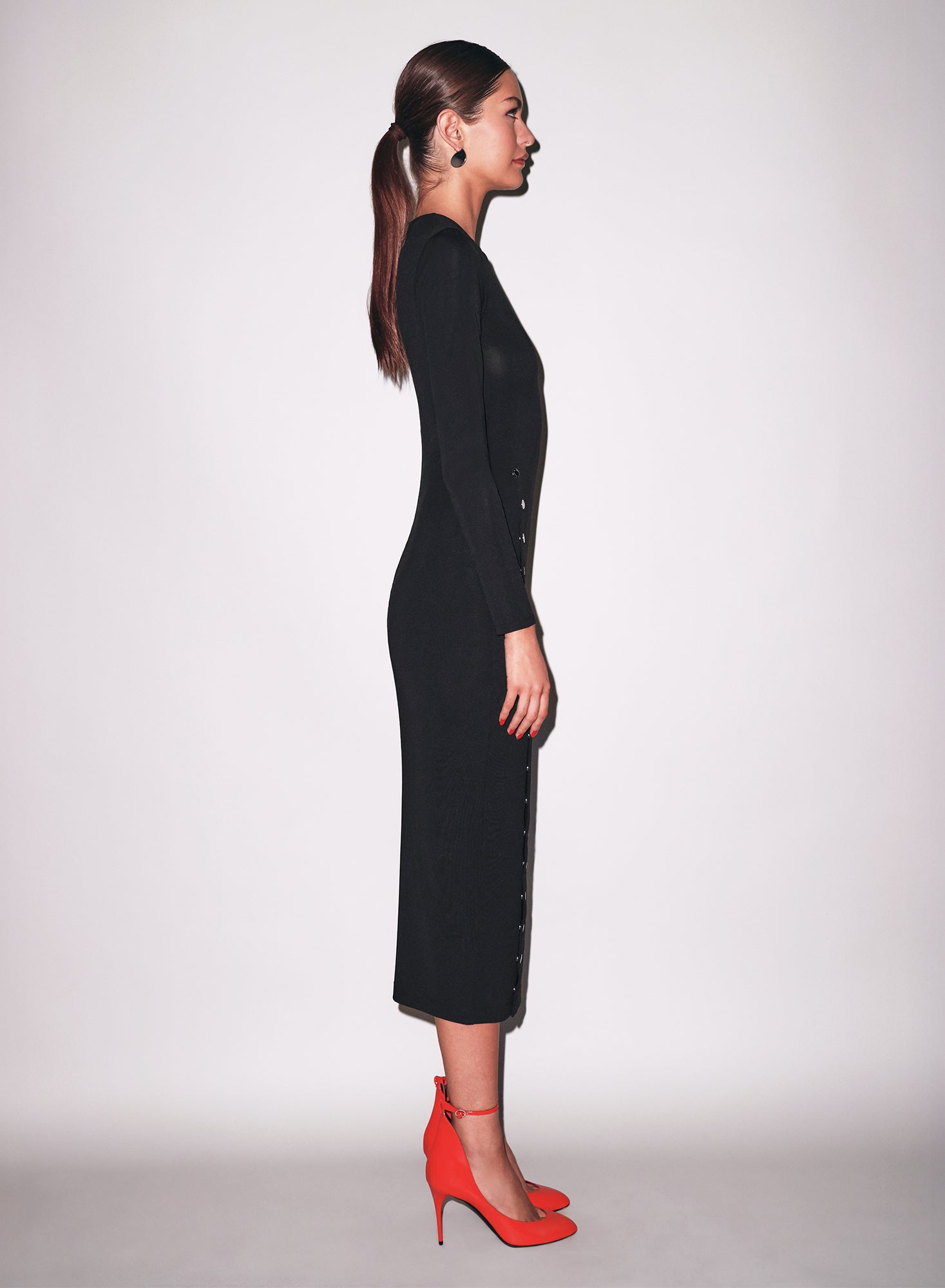 This luxe jersey dress hugs your curves in all the right places, with a flattering midi length and a back zipper for a smooth silhouette. The signature silver snap buttons let you adjust the hem to show as little or as much leg as you desire.
