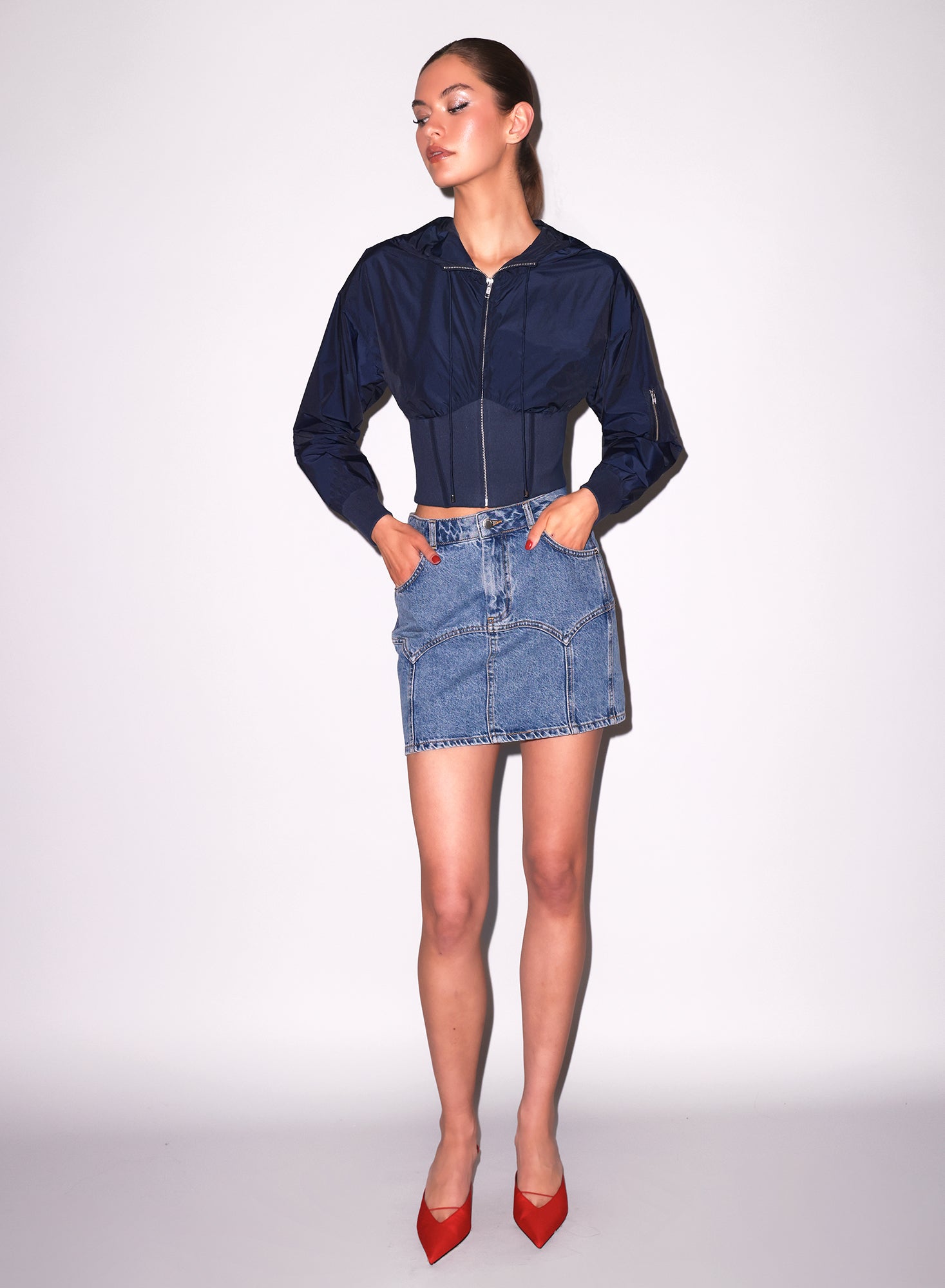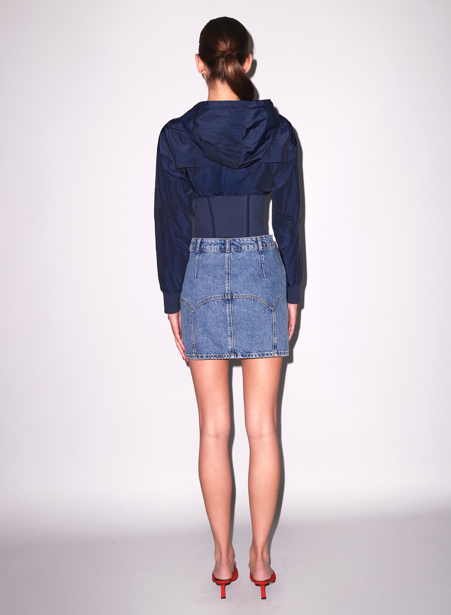 This nylon track jacket features slight ruching at the cups and corset seam details for a flattering shape, with relaxed sleeves, rib cuffs, and a back vent for easy movement. Pair it with a denim skirt for a playful, coordinated look.