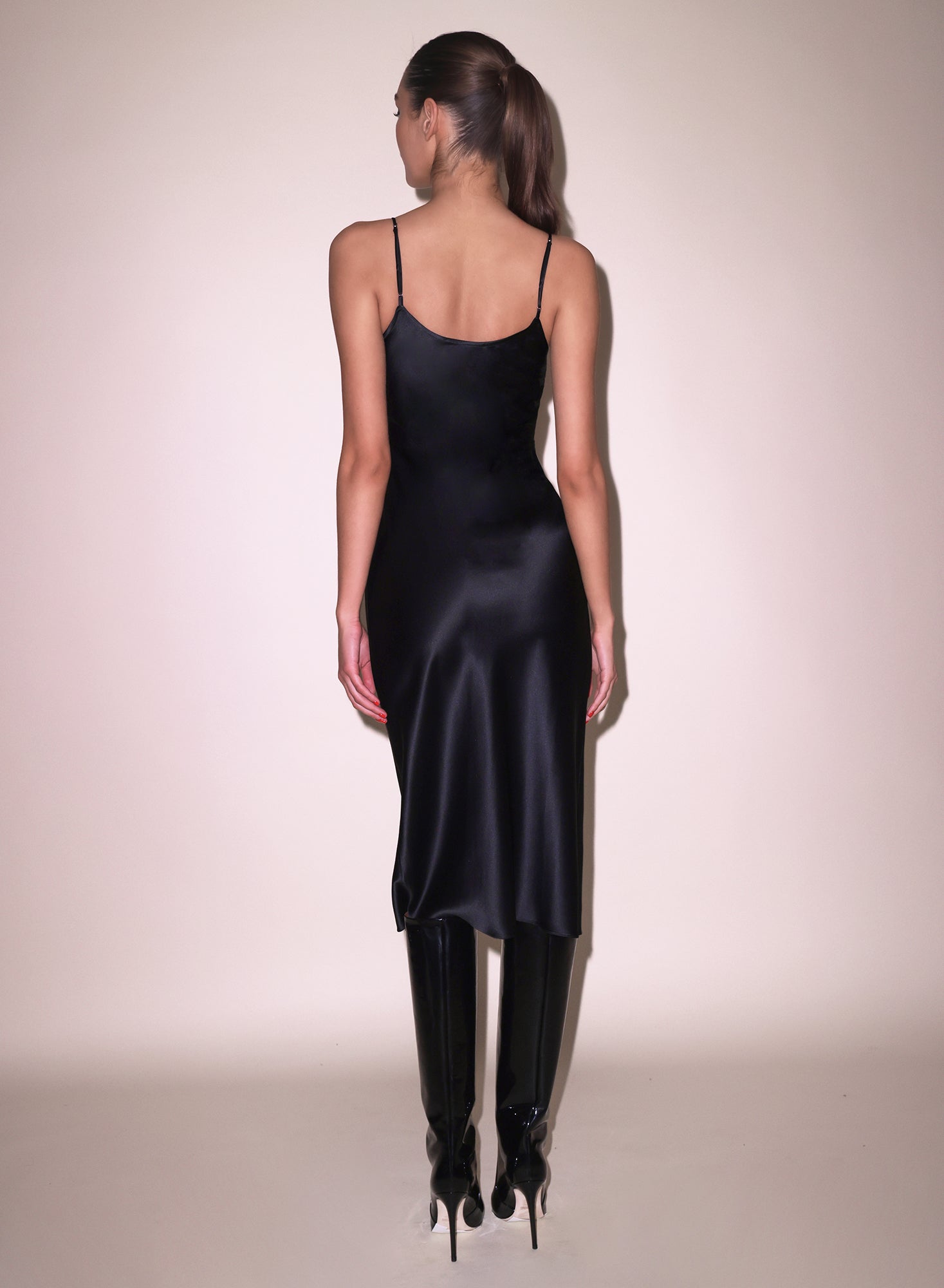 Cut from luxe bias cut silk charmeuse with a seductive lace v-neckline featuring dripping rose embroidery and adjustable silk straps for a personalized fit.