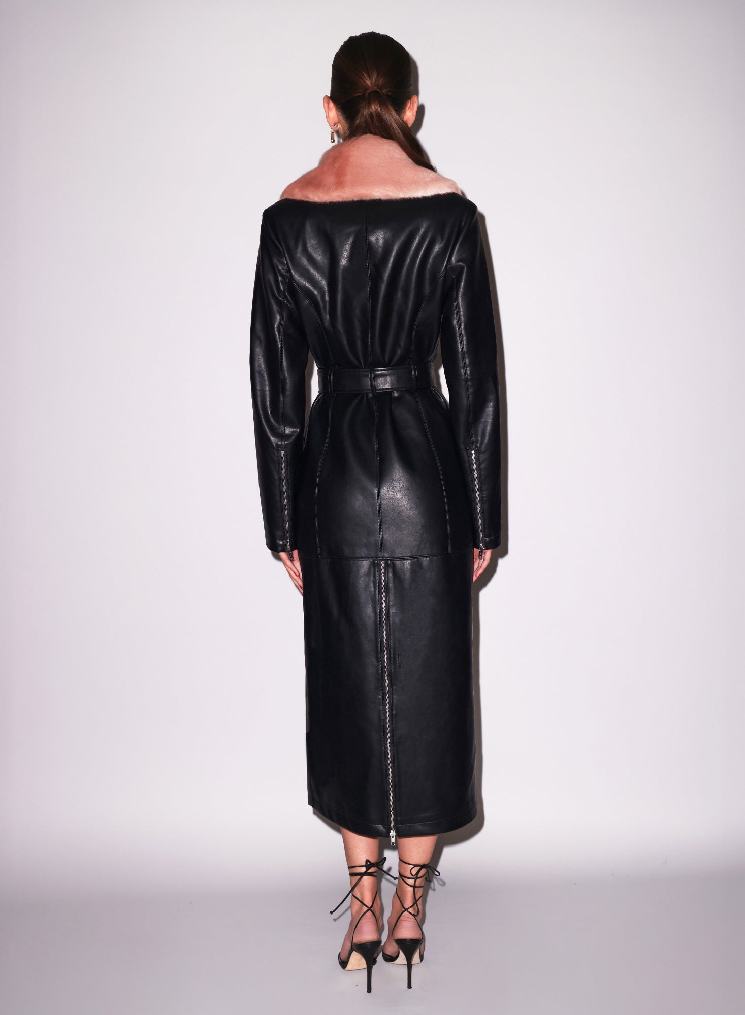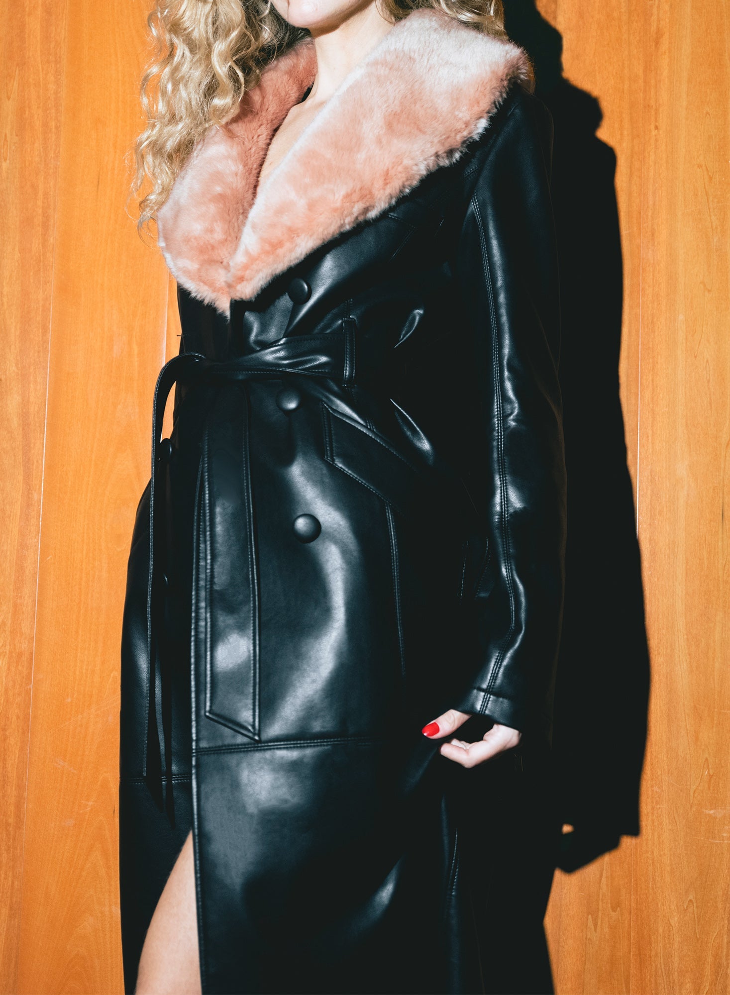 This vegan leather coat features a luxurious faux fur collar, a double-breasted front with a wrap belt for a cinched silhouette, and subtle silver zipper detailing on the cuffs and vented back. The fully lined construction ensures comfort and a polished finish.