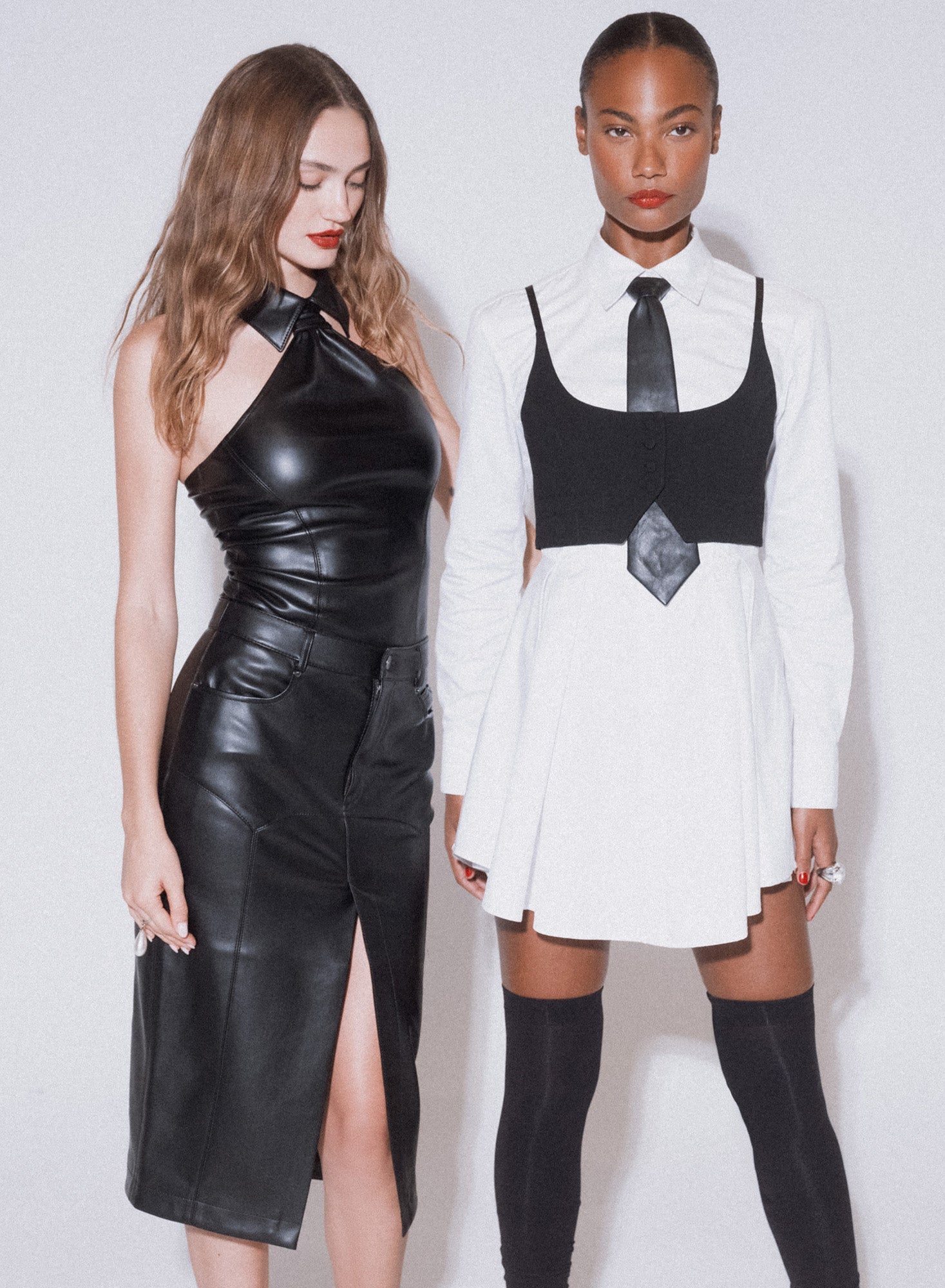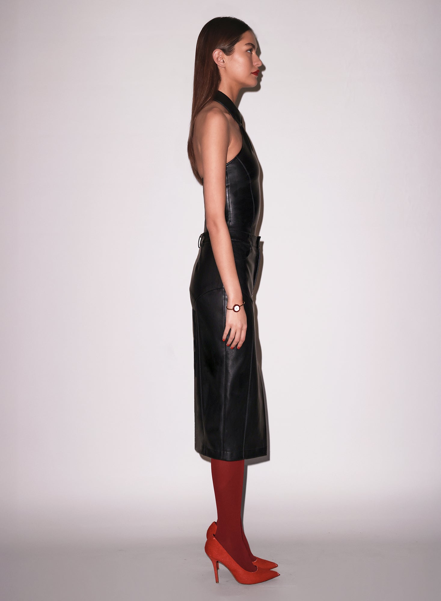 Our vegan leather skirt features a flattering high waist fit with garter seam details and functional pockets. A front slit adds a touch of allure, while the length falls just below the knee for a chic and sophisticated silhouette.